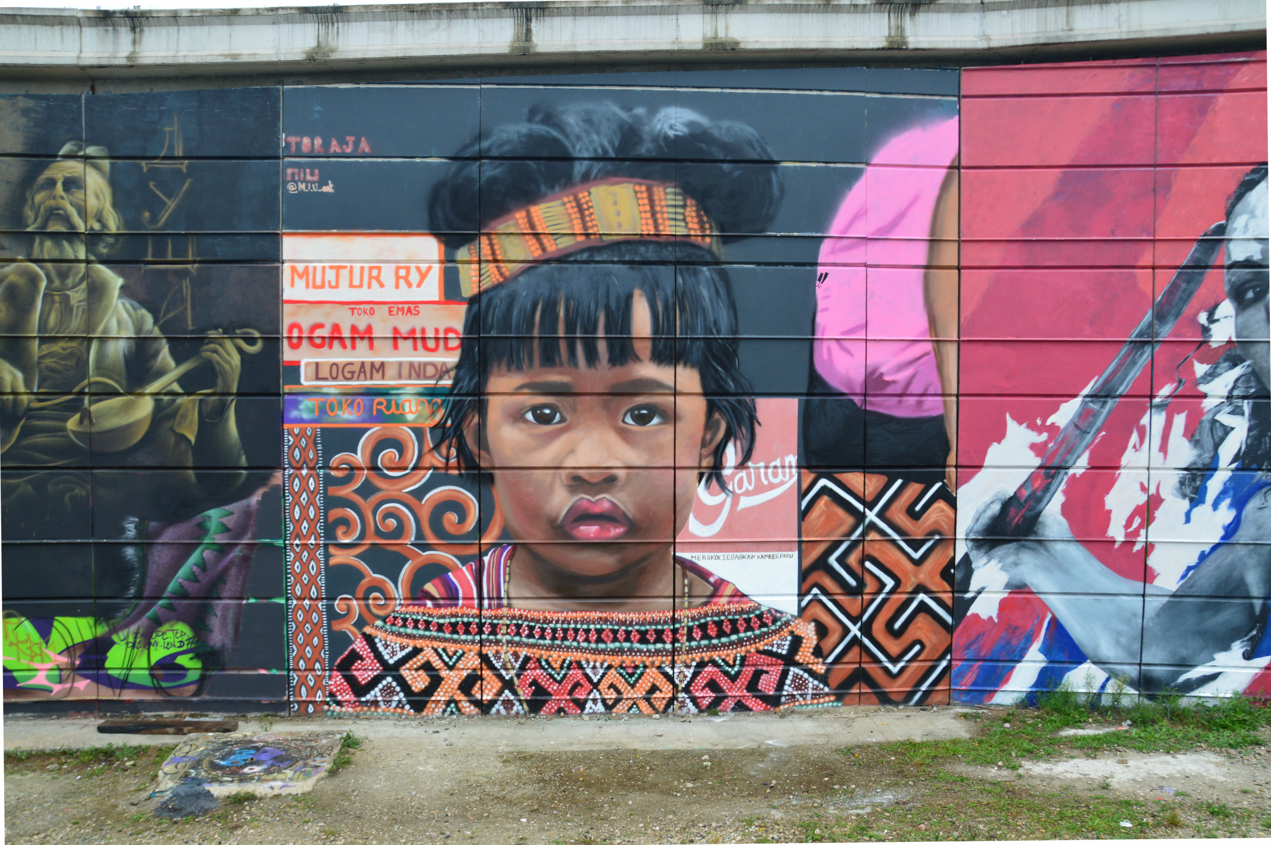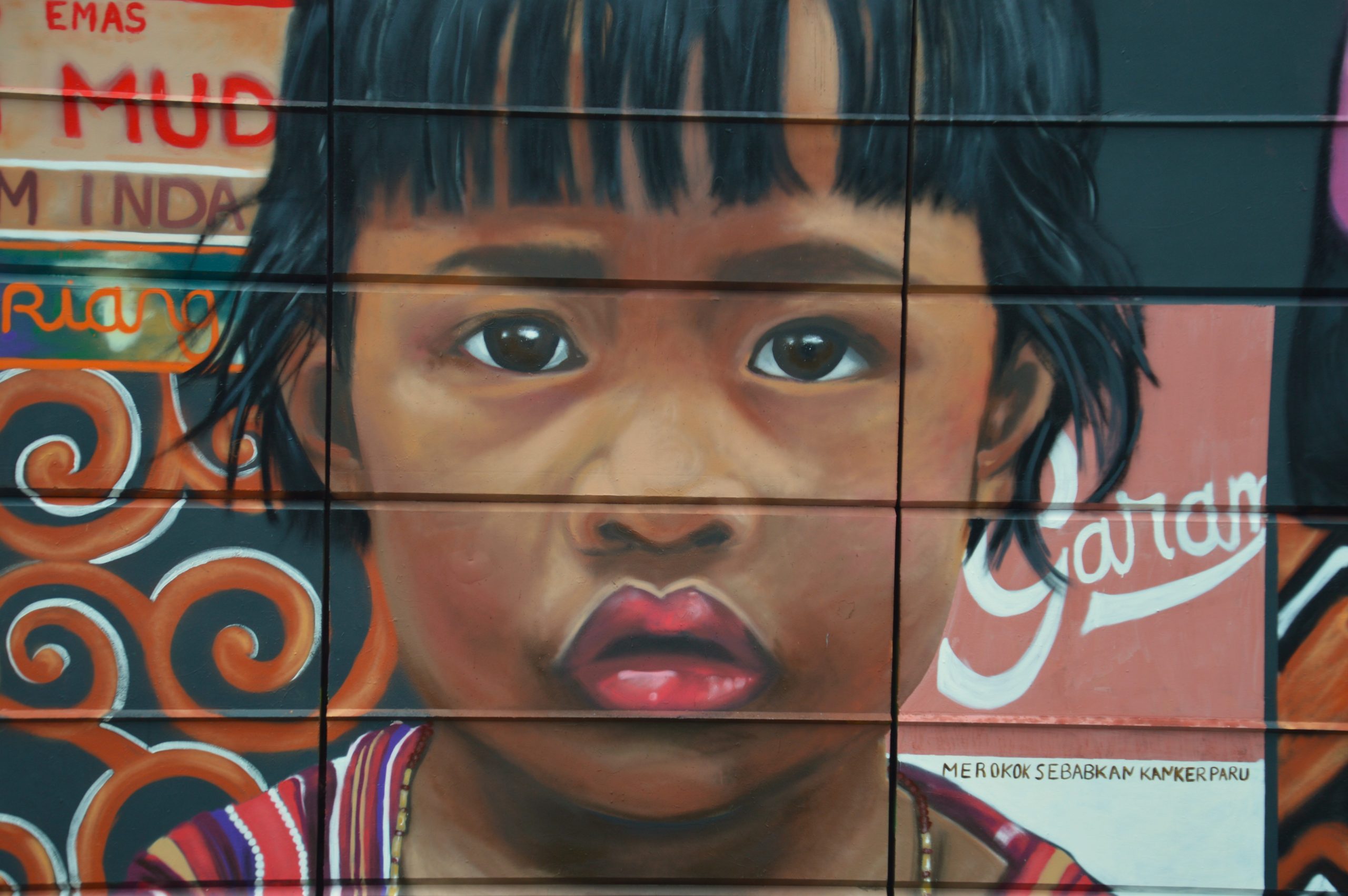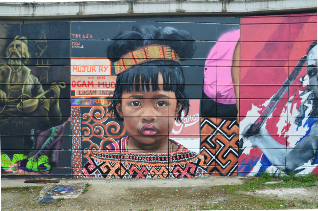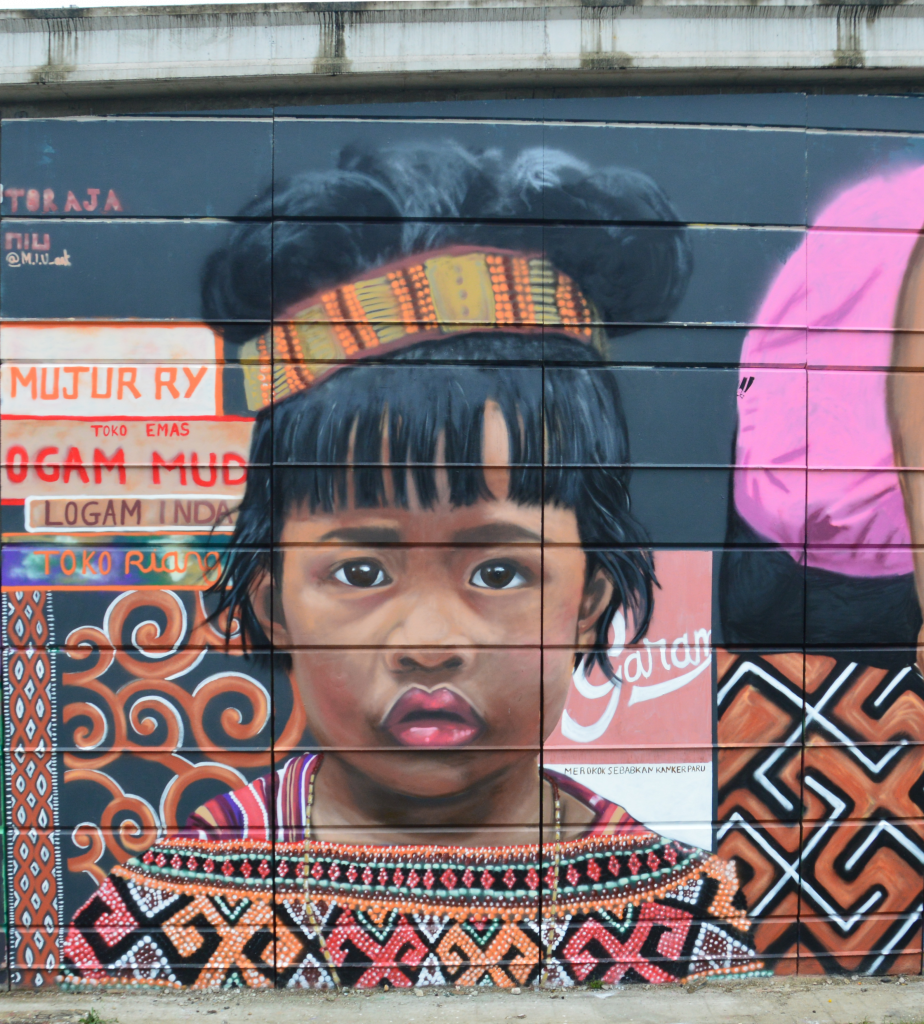 « J’ai travaillé à partir de photos que j’ai prises il y a 13 ans en pays Toraja. J’ai voulu raconter l’histoire de cette petite fille en apposant les motifs traditionnels de sa culture, pris sur des portes et des maisons de son village. J’ai également voulu reproduire le sac de sport de sa mère qui l’accompagnait et les différents logos publicitaires que l’on peut voir à quelques kilomètres afin de contraster les motifs de la culture traditionnelle avec les motifs urbains modernes qui font également partie de son histoire. »